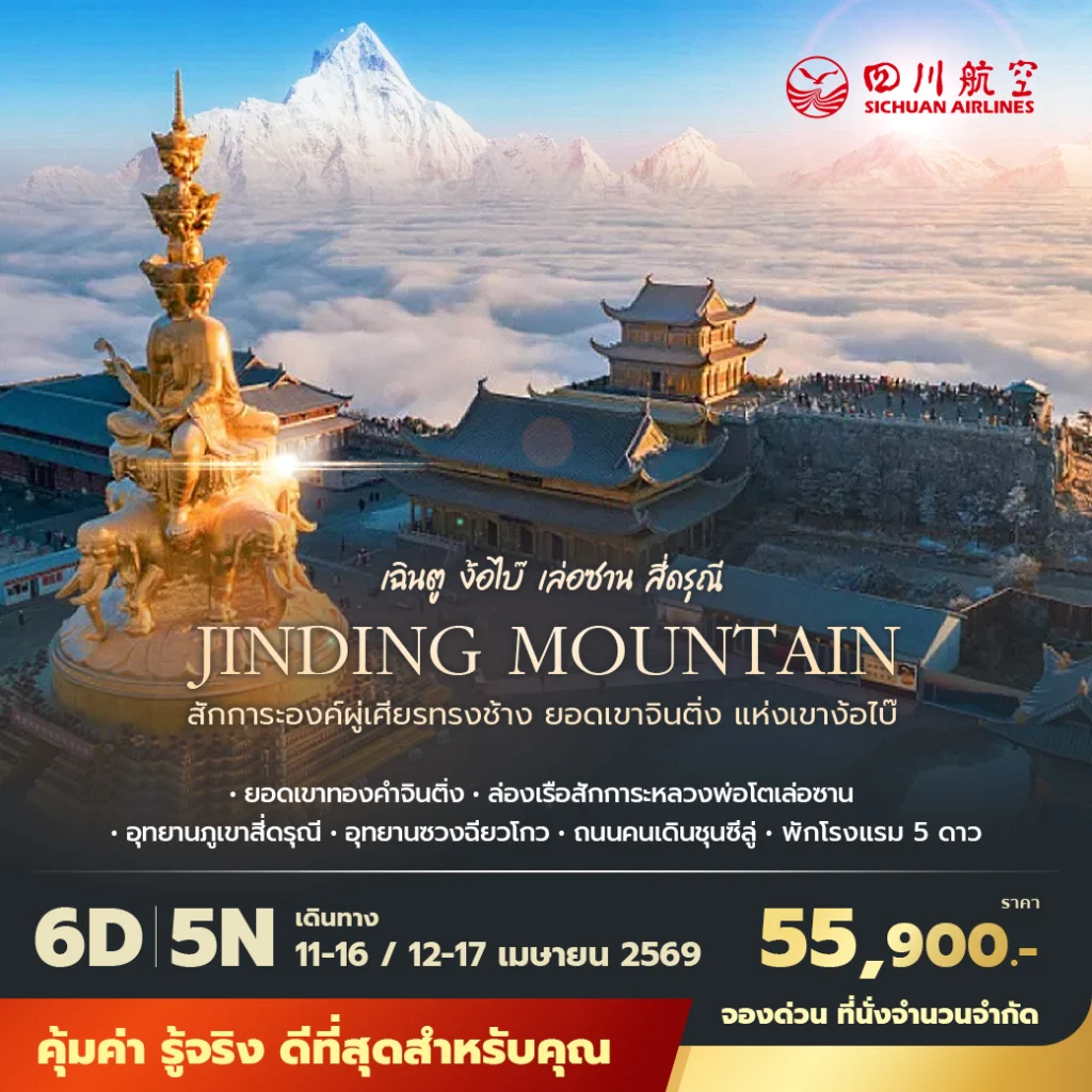 3U เฉินตู ง้อไบ๊ เล่อซาน สี่ดรุณี สักการะองค์ผู่เศียรทรงช้าง ยอดเขาจินติ่ง แห่งเขาง๊อไบ๊ 6วัน5คืน พัก 5 ดาว ไม่ลงร้าน ไม่ขายออปชั่น
